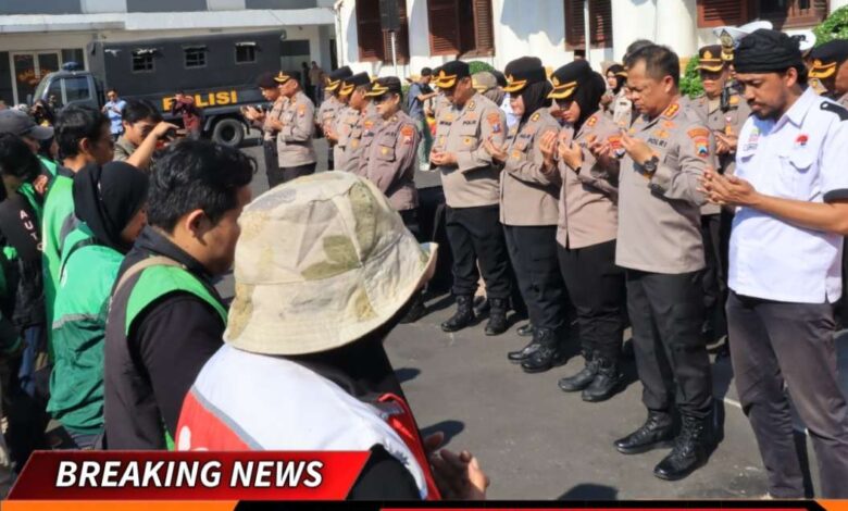Suasana keakraban Kapolrestabes Surabaya, Kombes Pol Luthfi Sulistiawan dengan para driver Ojol tampak pada kegiatan doa bersama untuk mendoakan almarhum Affan Kurniawan.