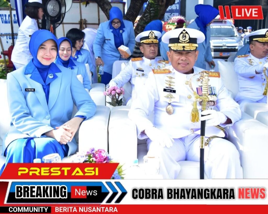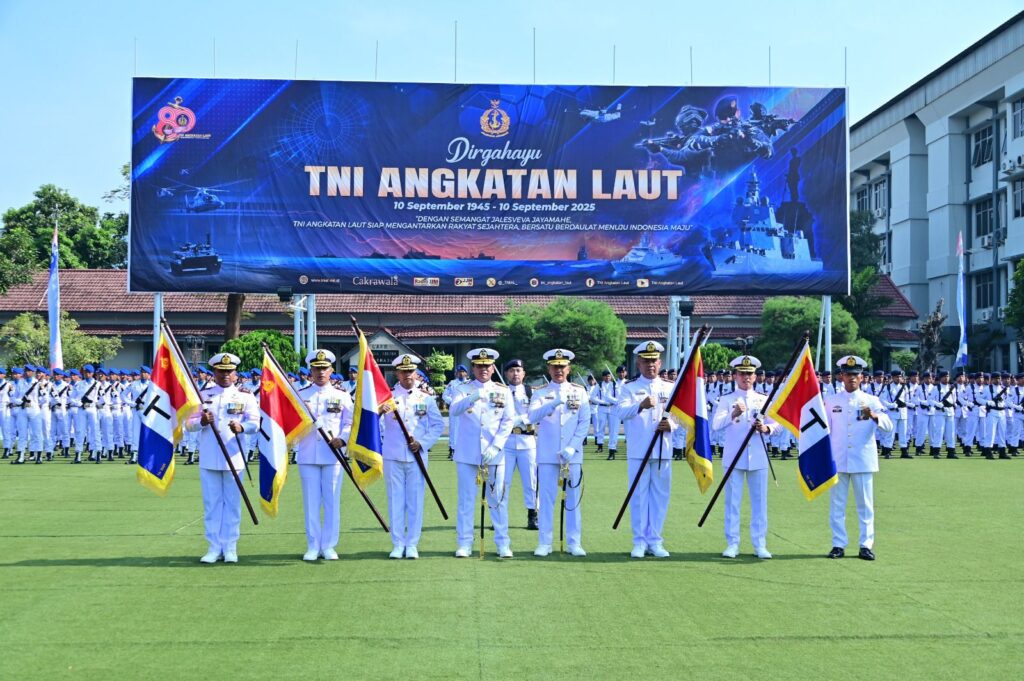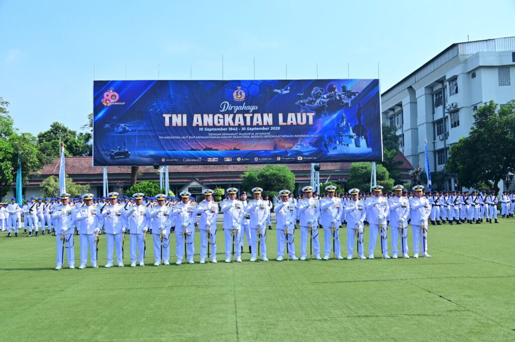 Dispen Kormar, TNI Angkatan Laut (Jakarta). Panglima Korps Marinir (Pangkormar) Letnan Jenderal TNI (Mar) Dr. Endi Supardi, S.E., M.M., M.Tr.Opsla., CHRMP., CRMP. didampingi Ketua Gabungan Jalasenastri Korps Marinir Ny. Nana Endi Supardi menghadiri Upacara Peringatan Hari Jadi Ke 80 TNI Angkatan Laut (TNI AL) yang dipimpin langsung Kepala Staf Angkatan Laut (Kasal) Laksamana TNI Dr. Muhammad Ali, S.E., M.M., M.Tr.Opsla yang digelar secara sederhana di Lapangan Apel Arafuru, Mako Koarmada RI, Jalan Gunung Sahari No. 67 Jakarta Pusat. Rabu (10/09/2025).