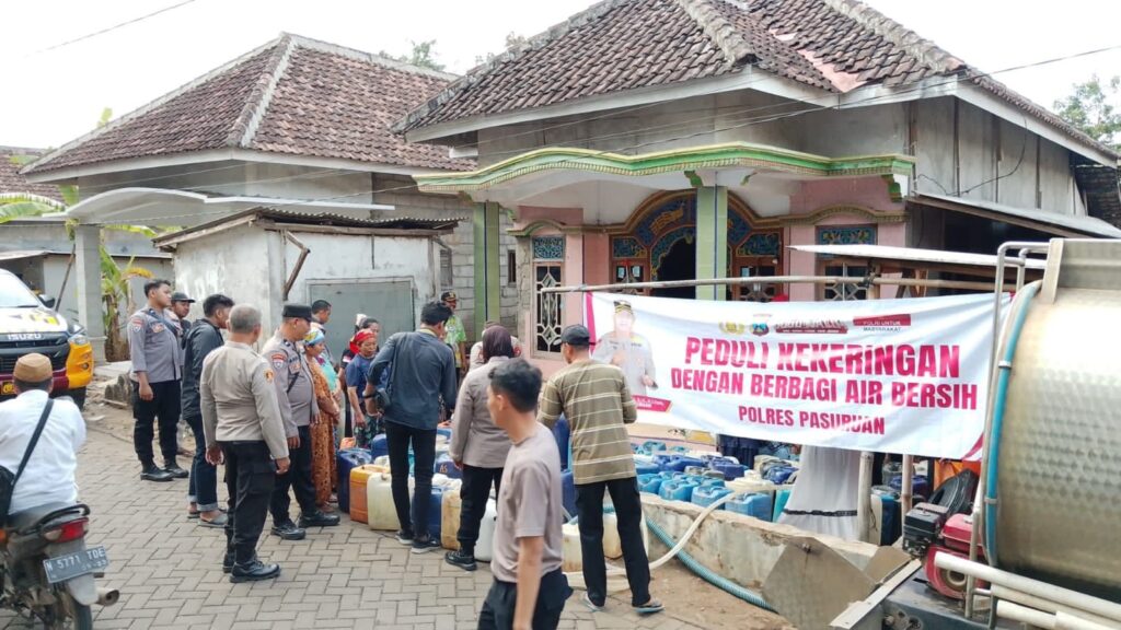 Polres Pasuruan bersama organisasi mahasiswa PC Pergerakan Mahasiswa Islam Indonesia (PMII) Pasuruan menyalurkan bantuan air bersih sebanyak 6.000 liter untuk warga Desa Karangjati, Kecamatan Lumbang, Kabupaten Pasuruan, Kamis (18/9/2025) sore.