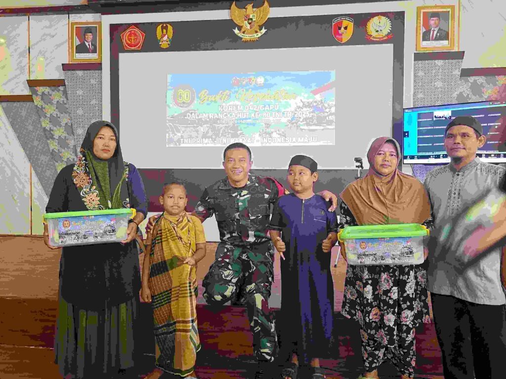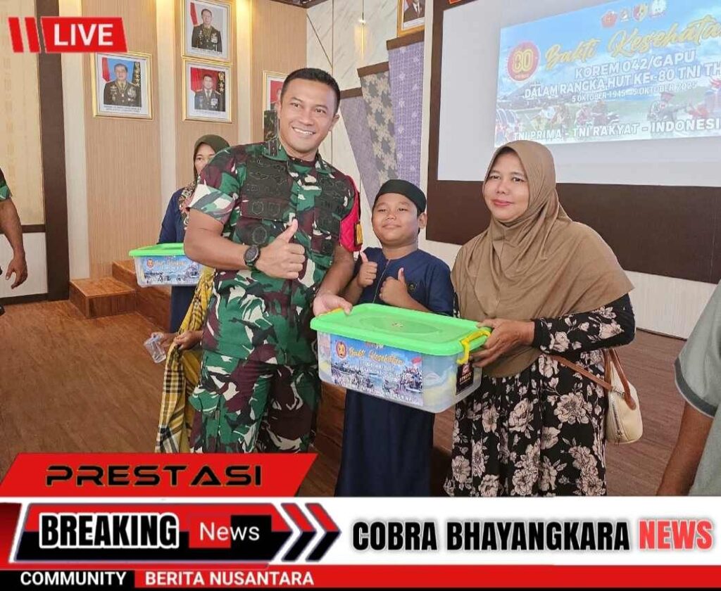 Jelang peringatan HUT ke-80 TNI tahun 2025, Kodim 0416/Bute berkolaborasi dengan Lions Club Jakarta Cosmo Bungo District 307-A1 membagikan 50 Paket Sembako pada acara Bakti Kesehatan yang diselenggarakan di Aula Sudirman Makodim 0416/Bute, Minggu (21/09/2025).
