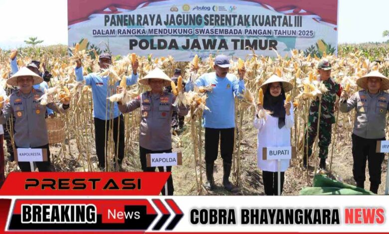 Kapolda Jawa Timur Irjen Pol. Drs. Nanang Avianto, M.Si., jajaran PJU Polda Jatim bersama Forkopimda Kabupaten Banyuwangi menggelar panen jagung serentak kuartal III di Kelurahan Sobo,Sabtu (27/9/2025).