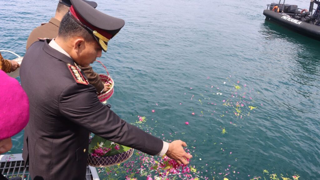 Setelah upacara selesai, rangkaian kegiatan dilanjutkan dengan prosesi tabur bunga di laut perairan Pelabuhan Boom Banyuwangi.