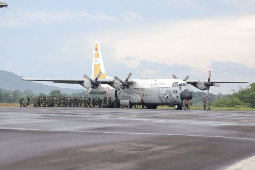 Prajurit Yonif 501 Kostrad tiba di Bandara Depati Amir, Bangka Belitung menggunakan pesawat C-130 Hercules, untuk melaksanakan Latihan Gabungan TNI. Latihan ini digelar untuk meningkatkan kesiapsiagaan TNI dalam menghadapi berbagai ancaman serta menjaga keamanan wilayah strategis di kawasan Bandara Depati Amir, Selasa (18/11/2025).