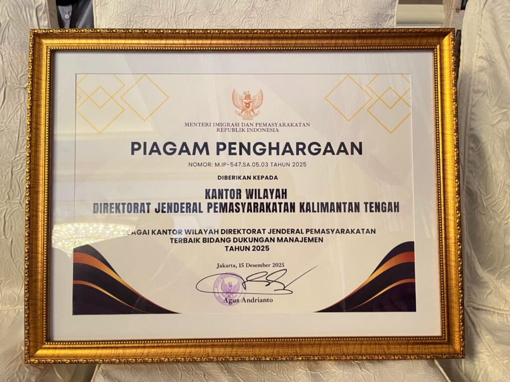 Kantor Wilayah Direktorat Jenderal Pemasyarakatan Kalimantan Tengah (Kanwil Ditjenpas Kalteng) menorehkan prestasi membanggakan dengan meraih penghargaan sebagai Kantor Wilayah Direktorat Jenderal Pemasyarakatan Terbaik se-Indonesia Bidang Dukungan Manajemen Tahun 2025. Penghargaan tersebut menjadi pengakuan atas kinerja optimal dan tata kelola manajemen yang efektif sepanjang tahun 2025, Selasa (16/12/2025)