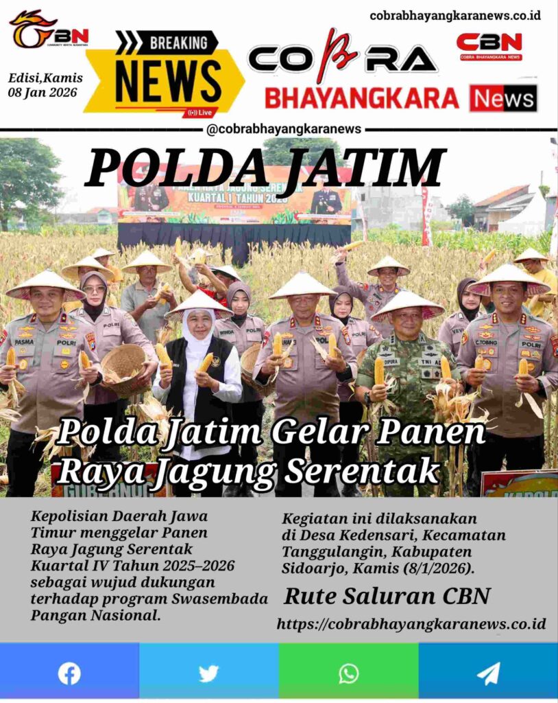 Kepolisian Daerah Jawa Timur menggelar Panen Raya Jagung Serentak Kuartal IV Tahun 2025–2026 sebagai wujud dukungan terhadap program Swasembada Pangan Nasional.
