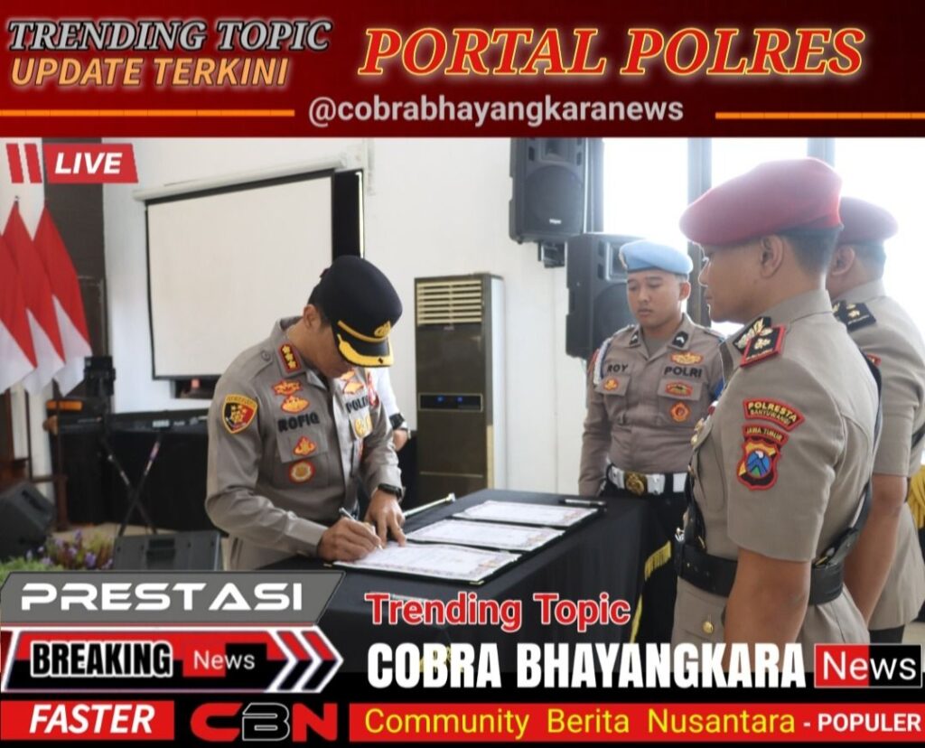 Kapolresta Banyuwangi Kombes Pol Dr. Rofiq Ripto Himawan, S.I.K., S.H., M.H., memimpin langsung upacara serah terima jabatan (sertijab) sejumlah Kasat dan Kapolsek jajaran Polresta Banyuwangi, Kamis pagi (20/1/2026), di Gedung Rupatama Wira Pratama Polresta Banyuwangi.