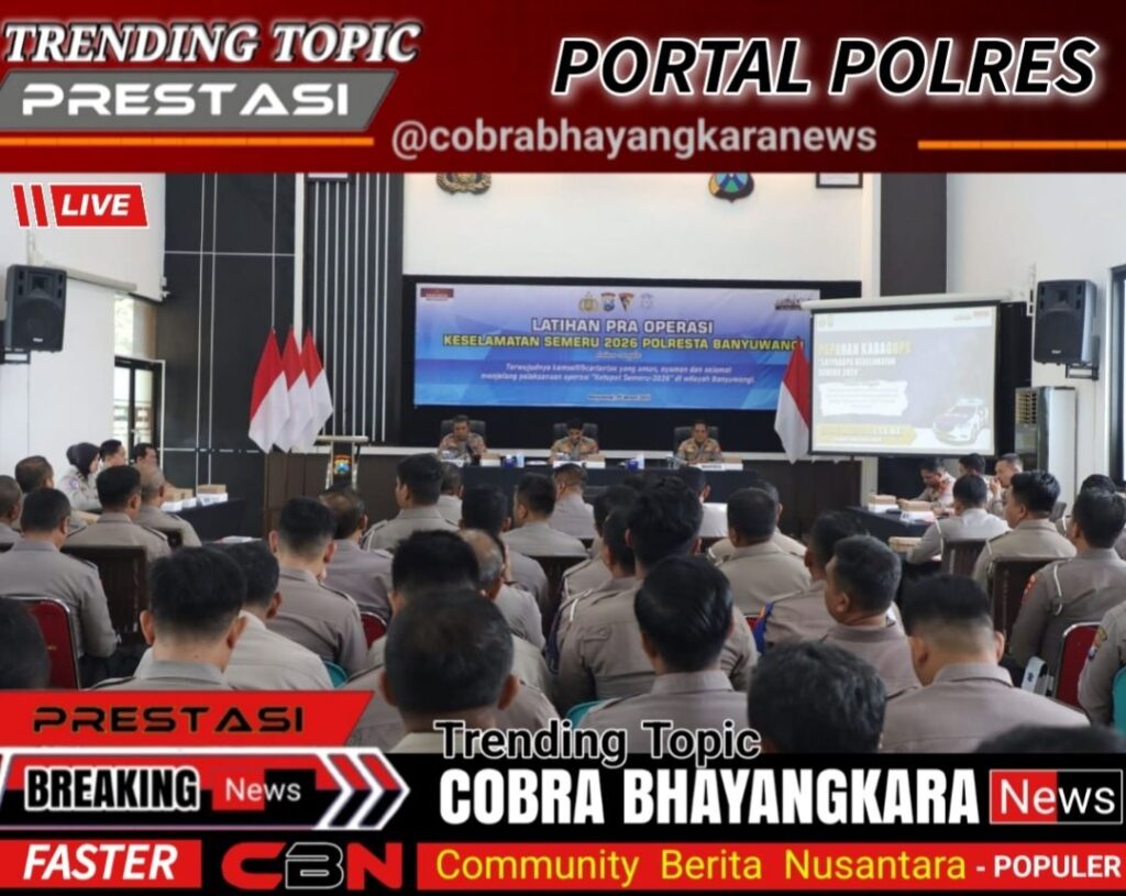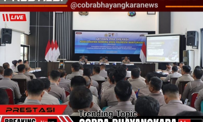 Dalam rangka memantapkan kesiapan personel menjelang pelaksanaan Operasi Keselamatan Semeru 2026, Polresta Banyuwangi menggelar Latihan Pra Operasi (Latpraops) yang dipimpin langsung oleh Kapolresta Banyuwangi Kombes Pol. Dr. Rofiq Ripto Himawan, S.I.K., S.H., M.H., Rabu (28/01/2026), bertempat di Rupatama Mapolresta Banyuwangi.