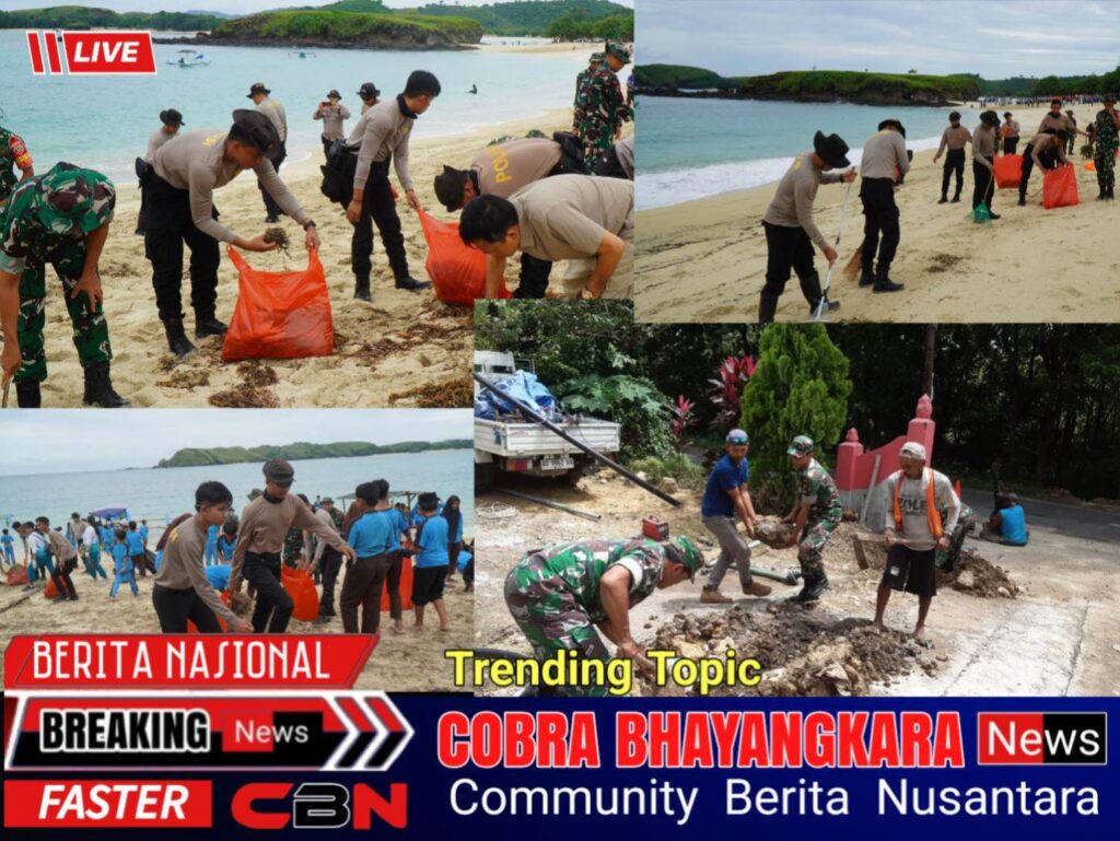 Polres Lombok Tengah bersama unsur TNI dan Pemerintah Daerah melaksanakan kegiatan kerja bhakti dan aksi bersih lingkungan di kawasan Pantai Tanjung Aan, Kecamatan Pujut, Kabupaten Lombok Tengah, Jumat.