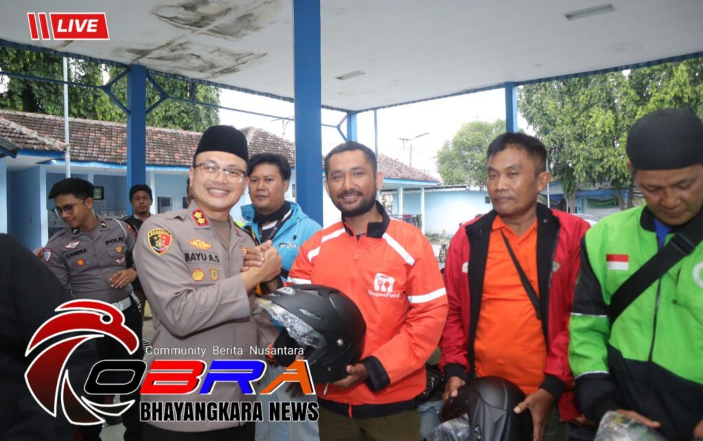 Sebagai bentuk apresiasi dan dukungan terhadap keselamatan kerja, Kapolres Situbondo membagikan helm dan jas hujan kepada para pengemudi ojol kamtibmas yang hadir.