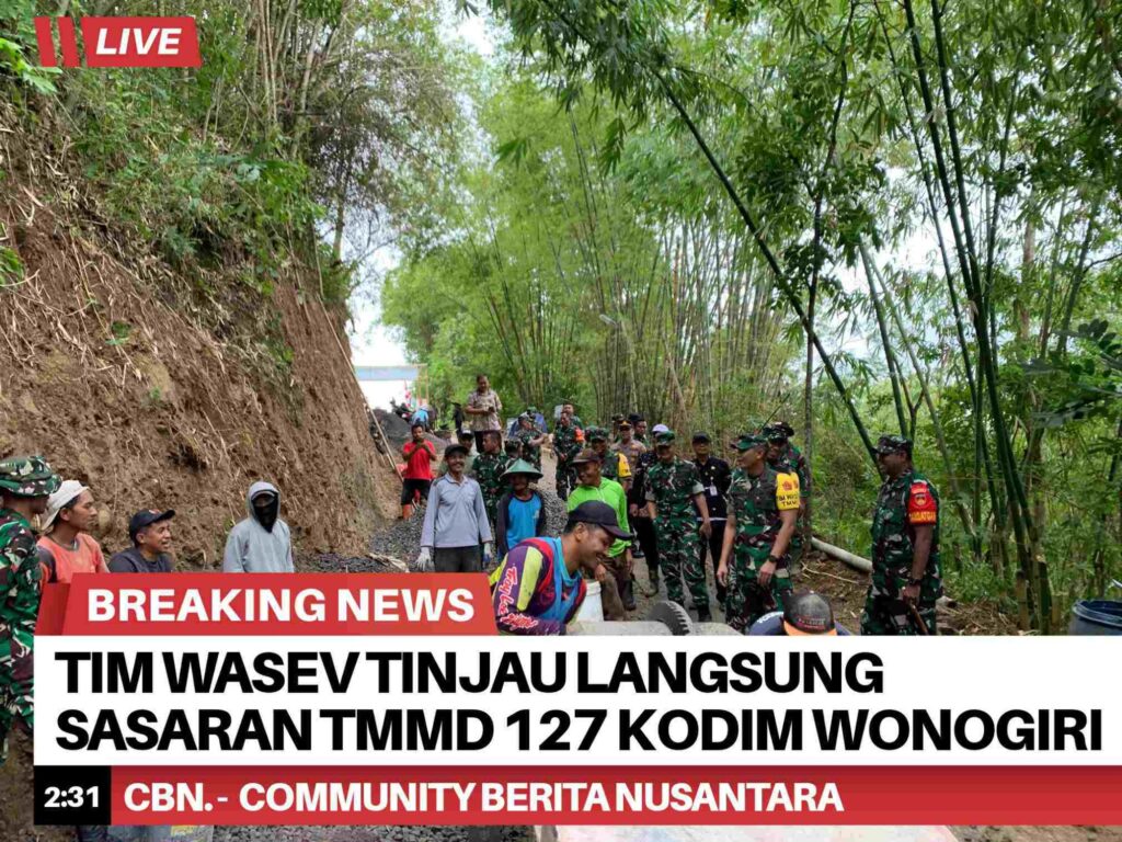 Tim Pengawasan dan Evaluasi (Wasev) TNI Manunggal Membangun Desa (TMMD) Reguler ke-127 TA 2026 berkesempatan mengunjungi pelaksanaan TMMD Kodim 0728/Wonogiri yang berada di Desa Kembang, Kecamatan Jatipurno, Kabupaten Wonogiri, Kamis (26/2/2026).
