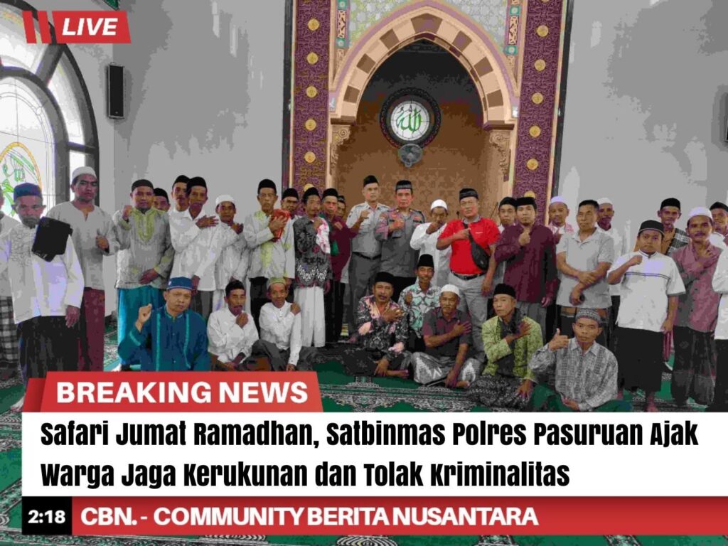 Satbinmas Polres Pasuruan menggelar Safari Shalat Jumat Dakwah Ramadhan di Masjid Darussalam, Dusun Welang, Desa Kedemungan, Kecamatan Kejayan, Kabupaten Pasuruan, Jumat (27/2/2026).