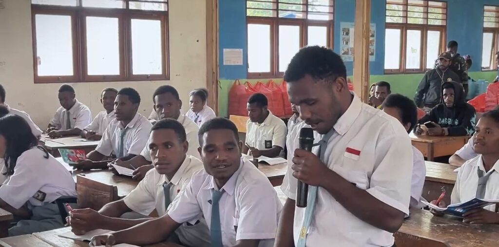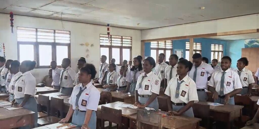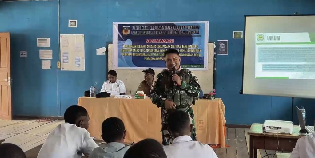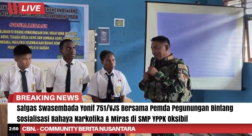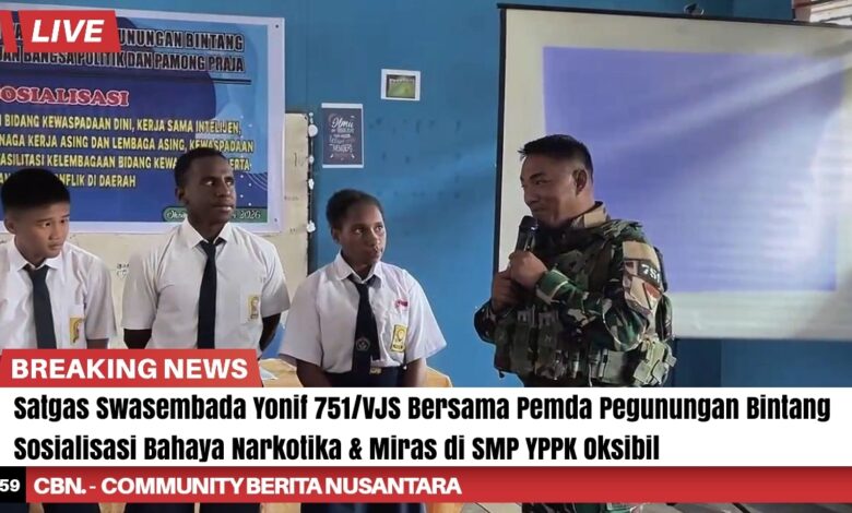 Satgas Swasembada Yonif 751/Vira Jaya Sakti (VJS) bersama Pemerintah Daerah Kabupaten Pegunungan Bintang melaksanakan kegiatan sosialisasi di SMP YPPK Oksibil terkait bahaya narkotika dan minuman keras (miras) yang dapat merusak kesehatan, masa depan, serta mengganggu ketertiban masyarakat. Kegiatan ini bertujuan membentengi generasi muda dari pengaruh negatif sejak dini dan menumbuhkan kesadaran untuk memilih gaya hidup sehat. (Minggu,1/3/2026).