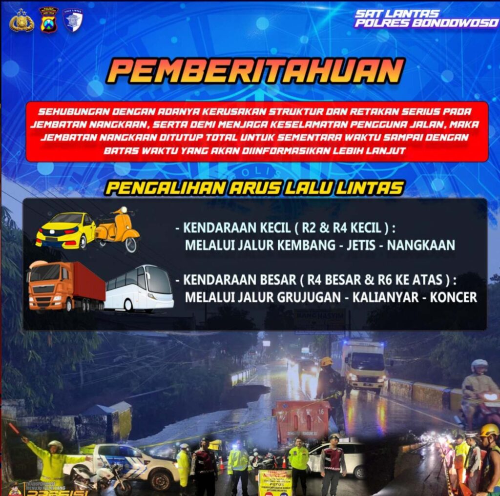 Dinamika lalu lintas di wilayah Kabupaten Bondowoso memasuki babak baru. Terputusnya Jembatan Sukowiryo yang menjadi akses vital penghubung Bondowoso dengan Kabupaten Jember memaksa aparat kepolisian bergerak cepat menyusun langkah strategis demi menjamin keamanan dan kelancaran mobilitas masyarakat.