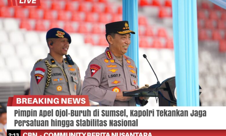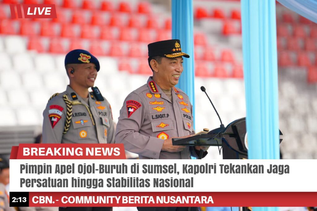 Sumsel – Kapolri Jenderal Listyo Sigit Prabowo memimpin apel ojek online (ojol) dan buruh kamtibmas ‘Nyago Bumi Sriwijaya Aman Bae’ di Stadion Bumi Sriwijaya, Kota Palembang, Sumatera Selatan (Sumsel). Dalam kegiatan ini, Ia menekankan bahwa, untuk terus menjaga nilai persatuan-kesatuan hingga stabilitas nasional.