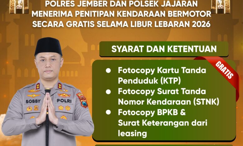 Menyambut momen mudik Lebaran 2026, Polres Jember bersama seluruh Polsek jajaran menghadirkan layanan penitipan kendaraan bermotor secara gratis bagi masyarakat. Program ini bertujuan memberikan rasa aman dan nyaman bagi warga yang meninggalkan rumah untuk pulang ke kampung halaman.