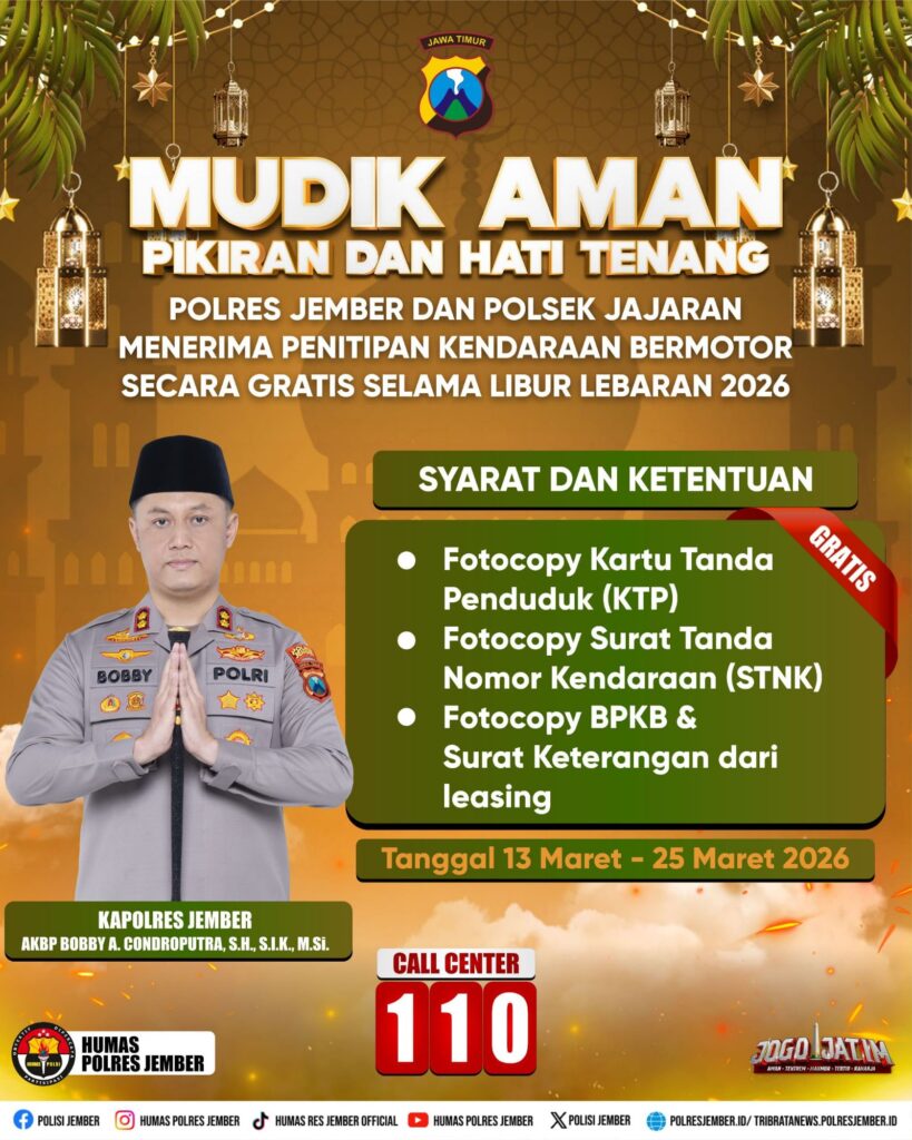 Melalui program bertajuk “Mudik Aman, Pikiran dan Hati Tenang”, masyarakat kini tidak perlu khawatir meninggalkan kendaraan di rumah selama libur Lebaran. Kendaraan bisa dititipkan di kantor polisi terdekat, baik di Mapolres Jember maupun di Polsek jajaran, dengan pengawasan petugas selama masa liburan.