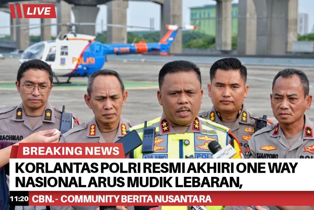 “Pada tanggal 18 Maret 2026 kami lakukan One Way. Hari ini (Jumat 20 Maret 2026), kami evaluasi bahwa kondisi arus cukup landai, cukup terkendali. Oleh sebab itu, hari ini Jumat 2026 pukul 13.00 WIB melakukan sosialisasi. Setelah sosialisasi, kami melakukan sterilisasi, clear untuk arus normal. Oleh sebab itu, atas seizin Bapak Kapolri, untuk arus mudik atau One Way Nasional sementara kami nyatakan ditutup pada pukul 13.22 WIB” kata Kakorlantas di Command Center KM 29 Tol Japek, Jumat (20/3/2026) siang.