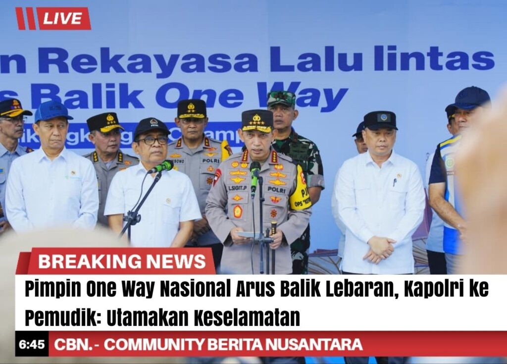 Kapolri Jenderal Listyo Sigit Prabowo memimpin langsung Flag Off pembukaan rekayasa lalu lintas (lalin) One Way nasional arus balik Lebaran di Gerbang Tol Kalikangkung, Jawa Tengah (Jateng), Selasa (24/3/2026).
