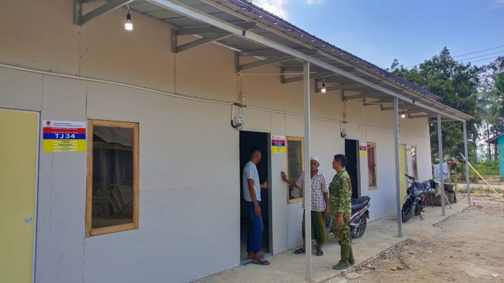 Warga yang sedang duduk-duduk di teras pun menyambut hangat kehadiran sang Babinsa. Obrolan ringan terjadi mengenai kondisi lingkungan dan kenyamanan hunian. “Senang kalau Pak Babinsa sering lewat begini, kami jadi merasa ada teman buat curhat kalau ada masalah di lingkungan Huntara,” ujar salah seorang warga yang ditemui di depan rumahnya.