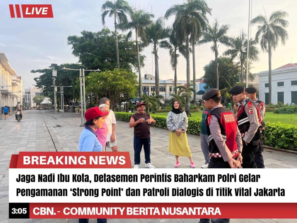 Guna memastikan denyut aktivitas masyarakat di pusat Jakarta berjalan aman dan tertib, Direktorat Samapta Korsabhara Baharkam Polri menerjunkan puluhan personel Detasemen Perintis untuk melaksanakan pengamanan Strong Point dan Patroli Dialogis di wilayah hukum Polda Metro Jaya, Senin (30/03/2026).