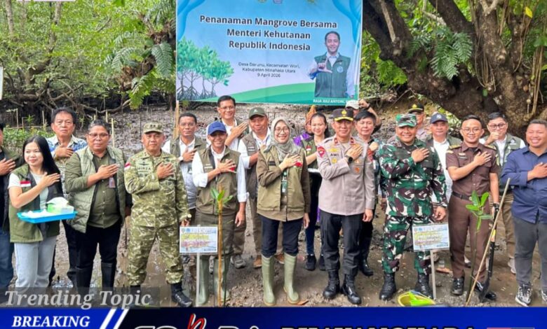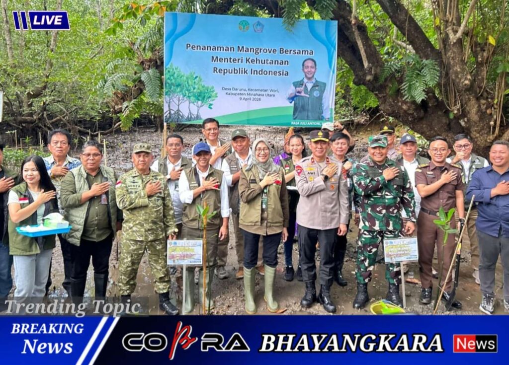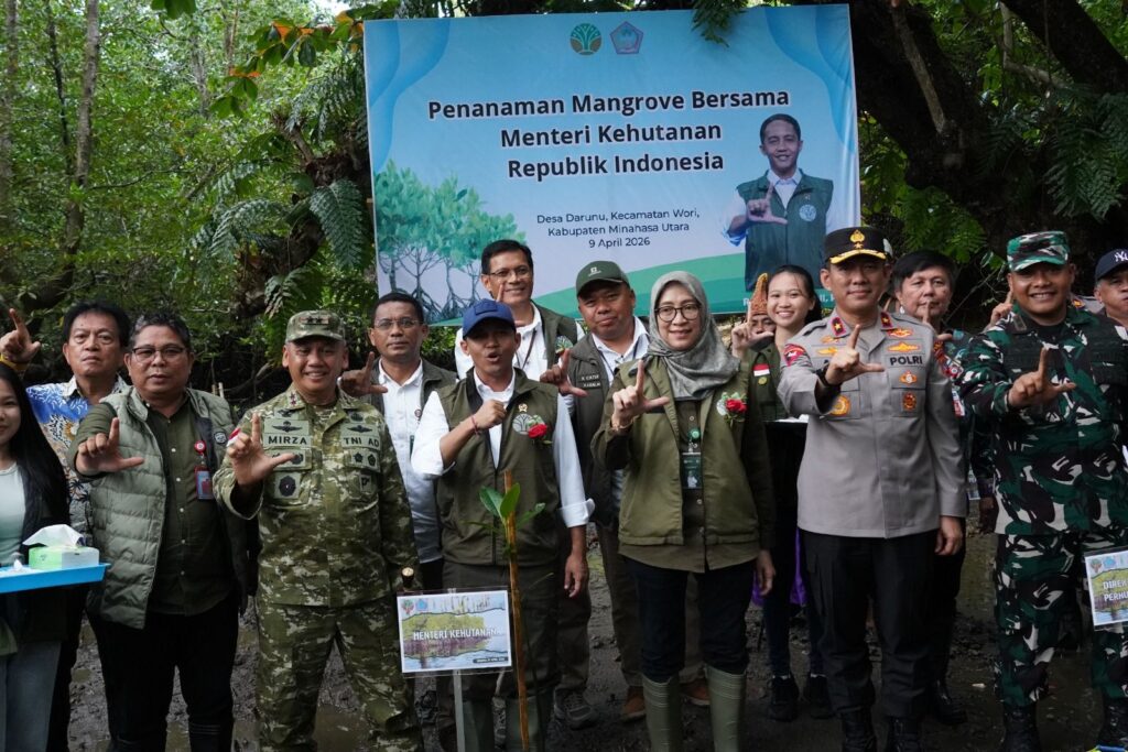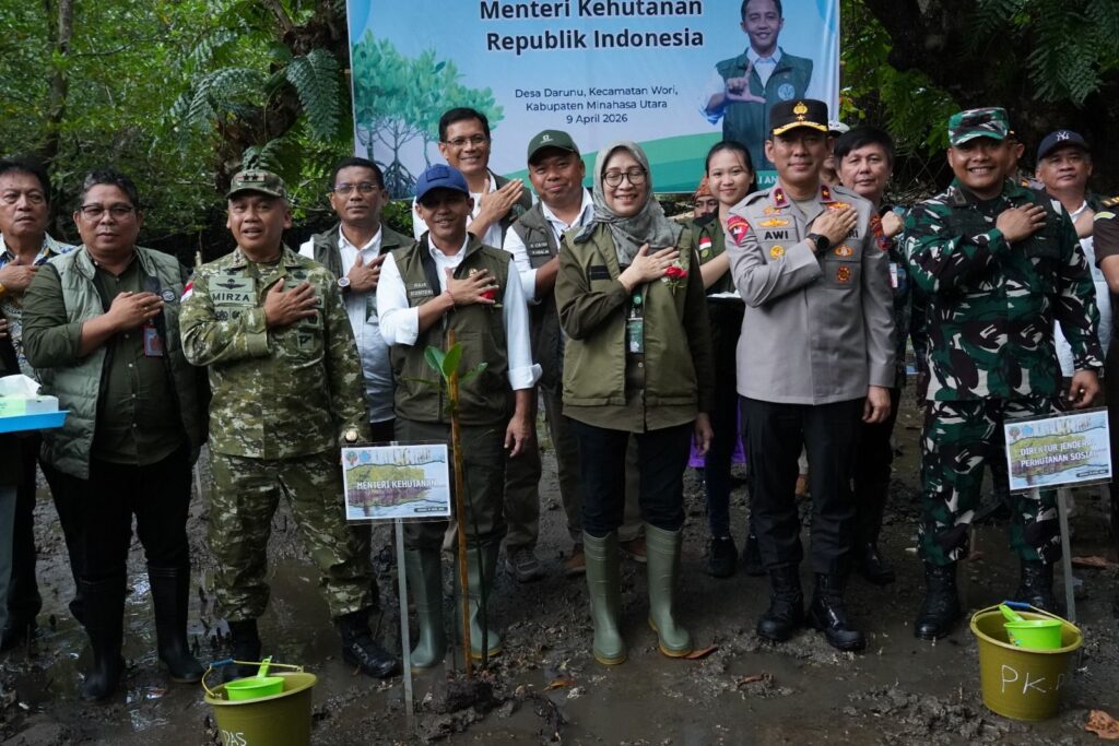 Komandan Kodim 1310/Bitung Letkol Inf Dewa Made DJ, turut mendampingi Pangdam XIII/Merdeka Mayjen TNI Mirza Agus, S.I.P., dalam kegiatan kunjungan kerja Menteri Kehutanan Republik Indonesia, Raja Antoni, Ph.D., yang berlangsung di Mangrove Park LPHD Dariaga Mudae, Desa Darunu, Kecamatan Wori, Kabupaten Minahasa Utara, Kamis (09/04/2026).