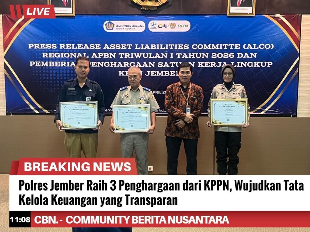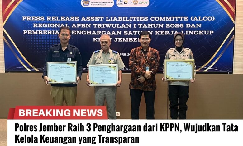 Dalam kegiatan press release Aset Liabilities Committee (ALCo) Regional APBN Triwulan I Tahun 2026, satuan kerja Polres Jember berhasil meraih tiga penghargaan sekaligus dari Kantor Pelayanan Perbendaharaan Negara (KPPN) Jember, Selasa, (14/4/2026)