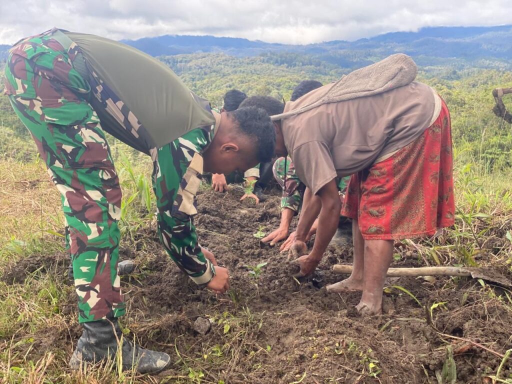 Dalam kegiatan tersebut, prajurit Pos Parim bersama masyarakat saling bahu-membahu menanam bibit kopi di lahan terbuka yang telah disiapkan. Selain memberikan edukasi mengenai cara penanaman, prajurit juga mendampingi masyarakat secara langsung dalam proses penanaman agar bibit dapat tumbuh dengan baik dan memberikan hasil yang bermanfaat di masa mendatang.