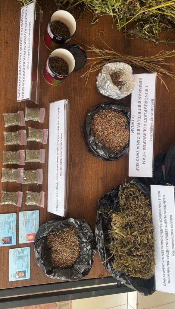 Barang bukti yang digelar di press release meliputi 50 batang pohon ganja, 8 batang pohon ganja, 87 batang pohon ganja, 10 bungkus narkotika jenis ganja, 1 bungkus plastik hitam berisi bibit ganja, 1 tas hitam berisi ganja, serta 2 bungkus plastik hitam kecil berisi ganja. Seluruh barang bukti tersebut menjadi bagian penting dalam proses penyidikan lebih lanjut oleh aparat penegak hukum.