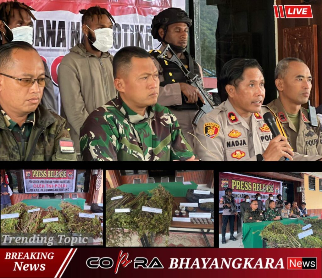 Aparat gabungan TNI-Polri melaksanakan kegiatan press release terkait pengungkapan tindak pidana narkotika di Kabupaten Pegunungan Bintang pada hari Rabu, 15 April 2026 di Polres Pegunungan Bintang. Kegiatan tersebut dihadiri langsung oleh Dansatgas Yonif 751/Vira Jaya Sakti (VJS) Letkol Inf Erwan Harliantoro sebagai bentuk dukungan dan komitmen bersama dalam pemberantasan peredaran narkotika di wilayah perbatasan. (Jumat, 17/4/2026).