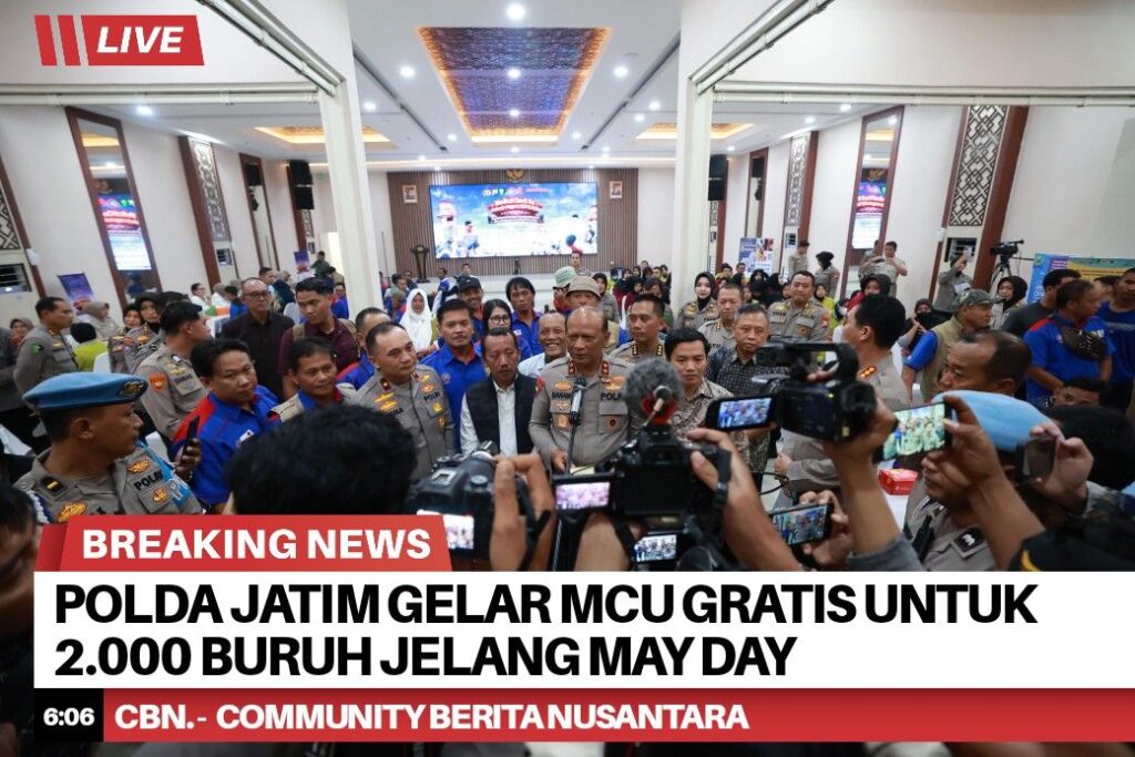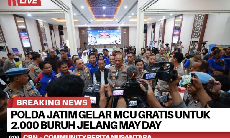 Menjelang peringatan Hari Buruh Internasional (May Day), Polda Jawa Timur menggelar layanan medical check up (MCU) gratis bagi sekitar 2.000 buruh di sejumlah wilayah sebagai bentuk kepedulian terhadap kesehatan pekerja.