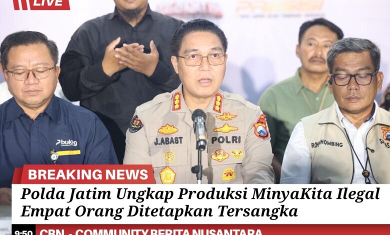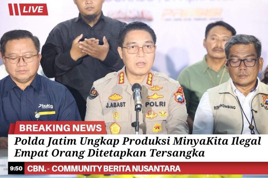 Direktorat Reserse Kriminal Khusus (Ditreskrimsus) Polda Jatim mengungkap kasus tindak pidana produksi minyak goreng sawit merk MinyaKita ilegal yang tidak memenuhi standar mutu, label, dan takaran.