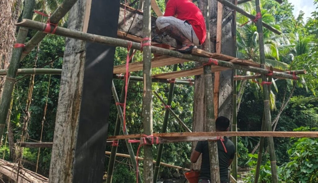 Terlihat, Babinsa Desa Sawangan Koramil 1310-06/Airmadidi Kodim 1310/Bitung Sertu Jemmy Korinus, turut serta melakukan plesteran dan acian tiang jembatan guna percepatan pembangunan jembatan gantung Perintis Garuda di Desa Sawangan Kec. Airmadidi Kab. Minahasa Utara, Sabtu (25/04/2026).