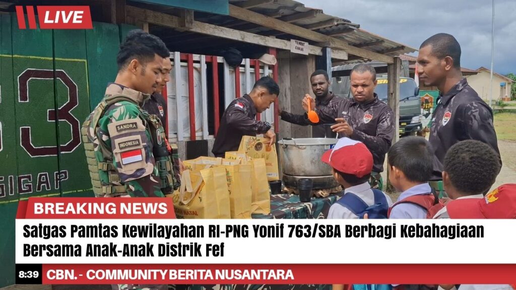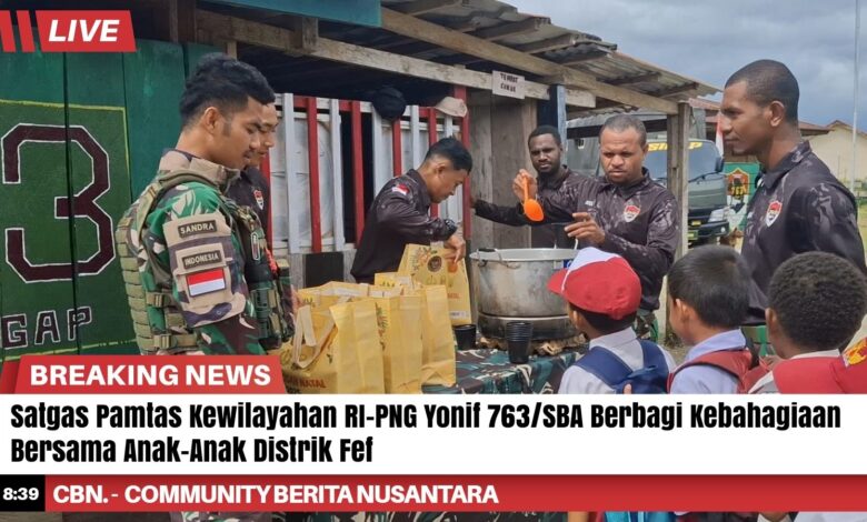 Satgas Pamtas RI–PNG Kewilayahan Yonif 763/SBA Pos Fef kembali menunjukkan kepedulian terhadap masyarakat dengan melaksanakan kegiatan berbagi kepada anak-anak di Distrik Fef. Dalam kegiatan tersebut, prajurit membagikan kacang hijau dan biskuit sebagai bentuk perhatian terhadap asupan gizi dan kebahagiaan anak-anak di wilayah perbatasan. (26/4/2026).