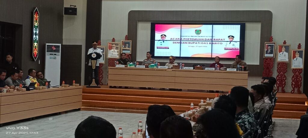 Setelah melakukan pengecekan dan melihat secara langsung keadaan panca banjir di wilayah Barsel, Gubernur Kalteng mengadakan acara pertemuan dan rapat dengan Bupati se – Das Barito di Aula Dinas Pekerjaan Umum dan Perumahan Rakyat. Minggu, (27/04/2025) Jam 18.30 WIB.Malam