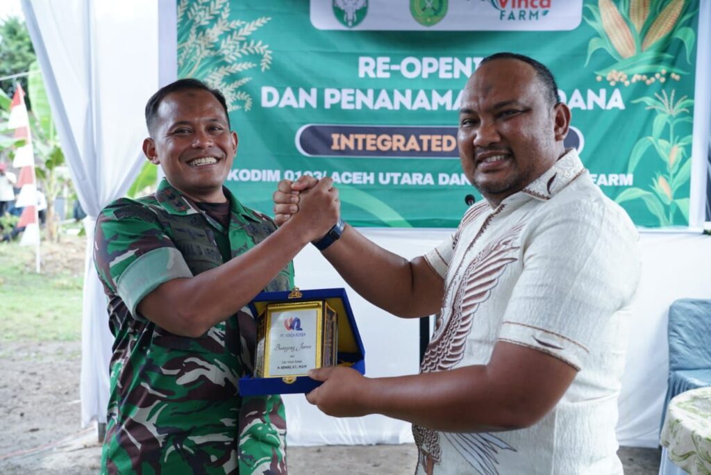 Acara dilanjutkan dengan penyerahan cenderamata dari H. Azhari kepada Danrem 011/Lw, Danlanal Lhokseumawe, dan Dandim 0103/Aut. Setelah pembacaan doa, para tamu undangan secara simbolis melakukan penanaman jagung perdana sebagai tanda dimulainya kembali aktivitas pertanian di lahan tersebut.